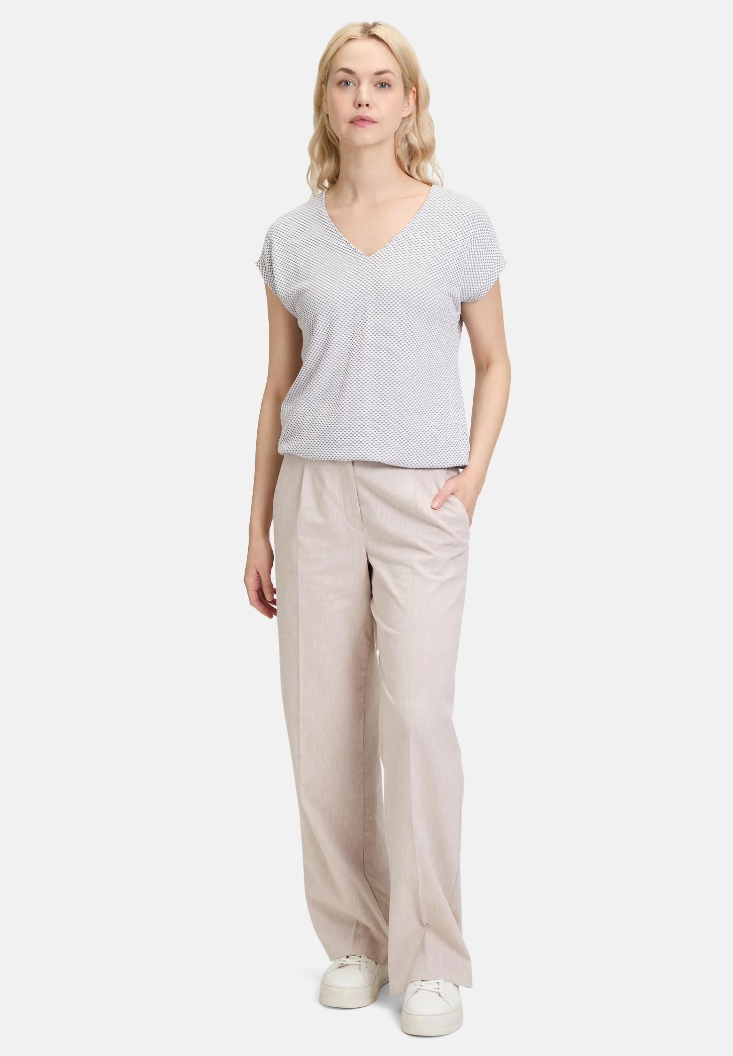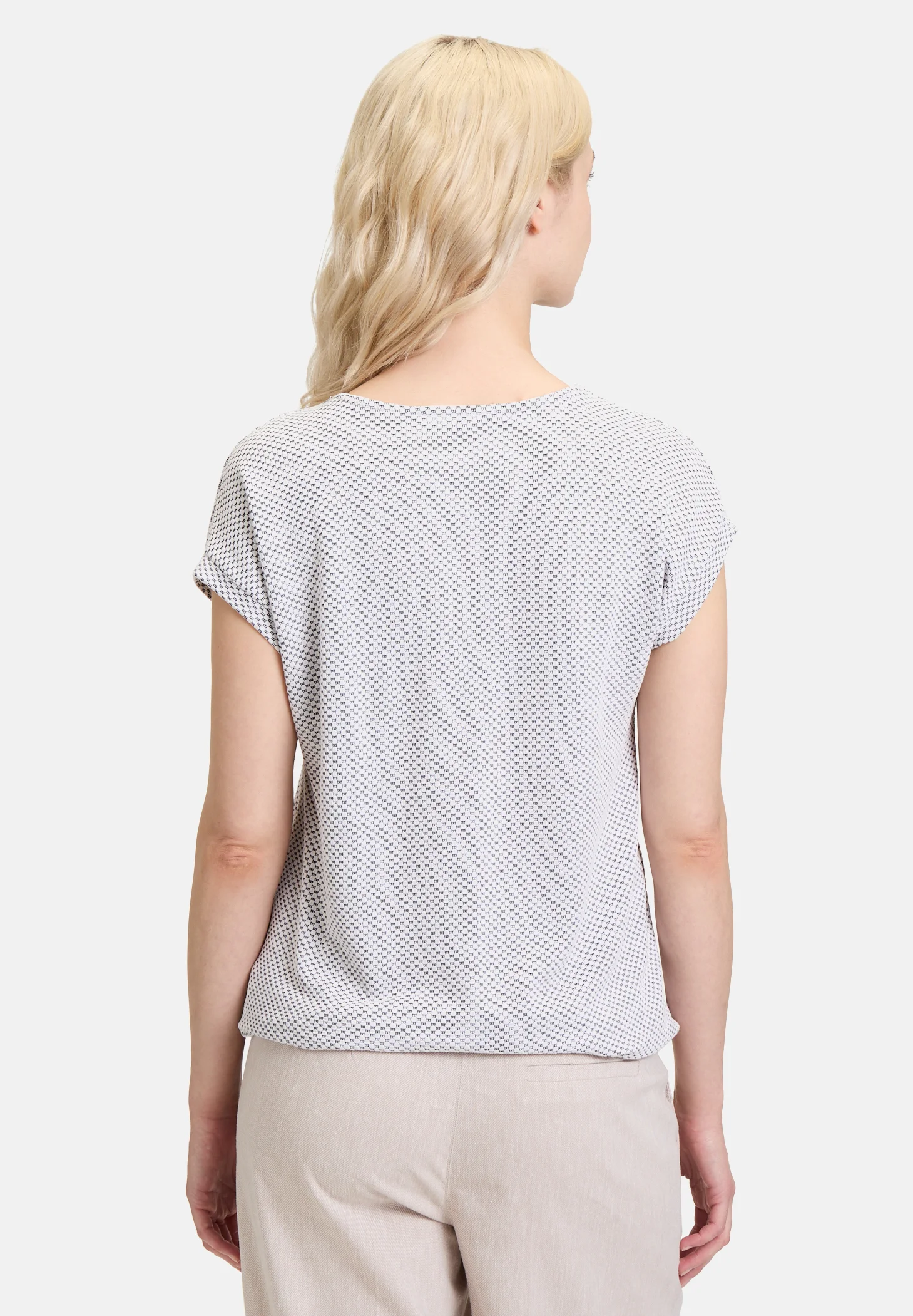 The intricate micro-check design or woven dot pattern lends a subtle sophistication to this Betty Barclay creation, elevating it beyond the ordinary. The craftsmanship and attention to detail make this top more than just a wardrobe essential; it’s a statement piece that blends a polished aesthetic with everyday practicality. Perfect for any season and easy to layer, this top is as versatile as it is timeless.