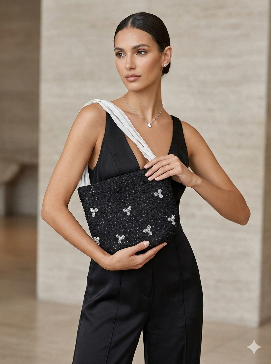 Elevate your evening ensemble with this unique black textured fabric handbag. Combining classic vintage charm with modern sophistication, this accessory is designed to complement formal events such as weddings, galas, and upscale parties. Crafted for those who appreciate understated luxury, it promises to be the perfect finishing touch to your outfit.