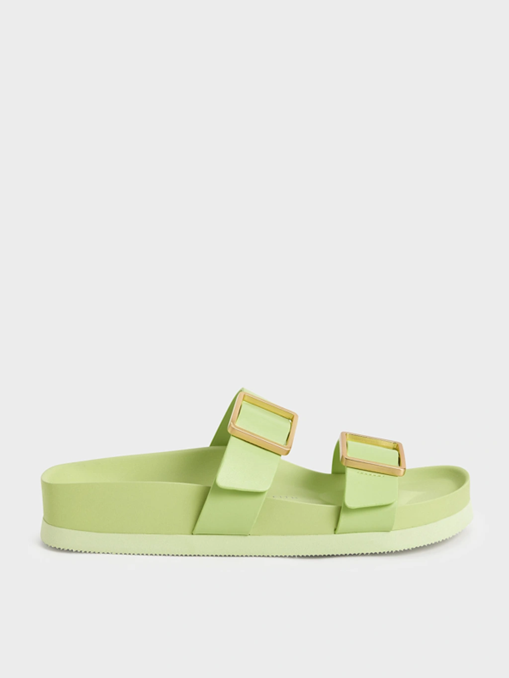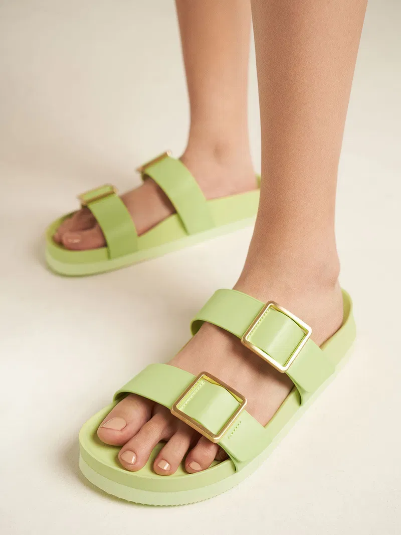 CHARLES & KEITH Sage Green Double-Strap Flatform Slides with Gold Buckles