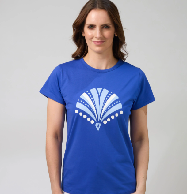 Bring vibrant energy to your wardrobe with our royal blue crew neck t-shirt, designed to combine comfort and style effortlessly. The eye-catching white and light blue Art Deco-inspired fan or shell graphic adds a pop of personality to this classic tee, making it a perfect choice for expressing your unique sense of fashion while staying comfortable.