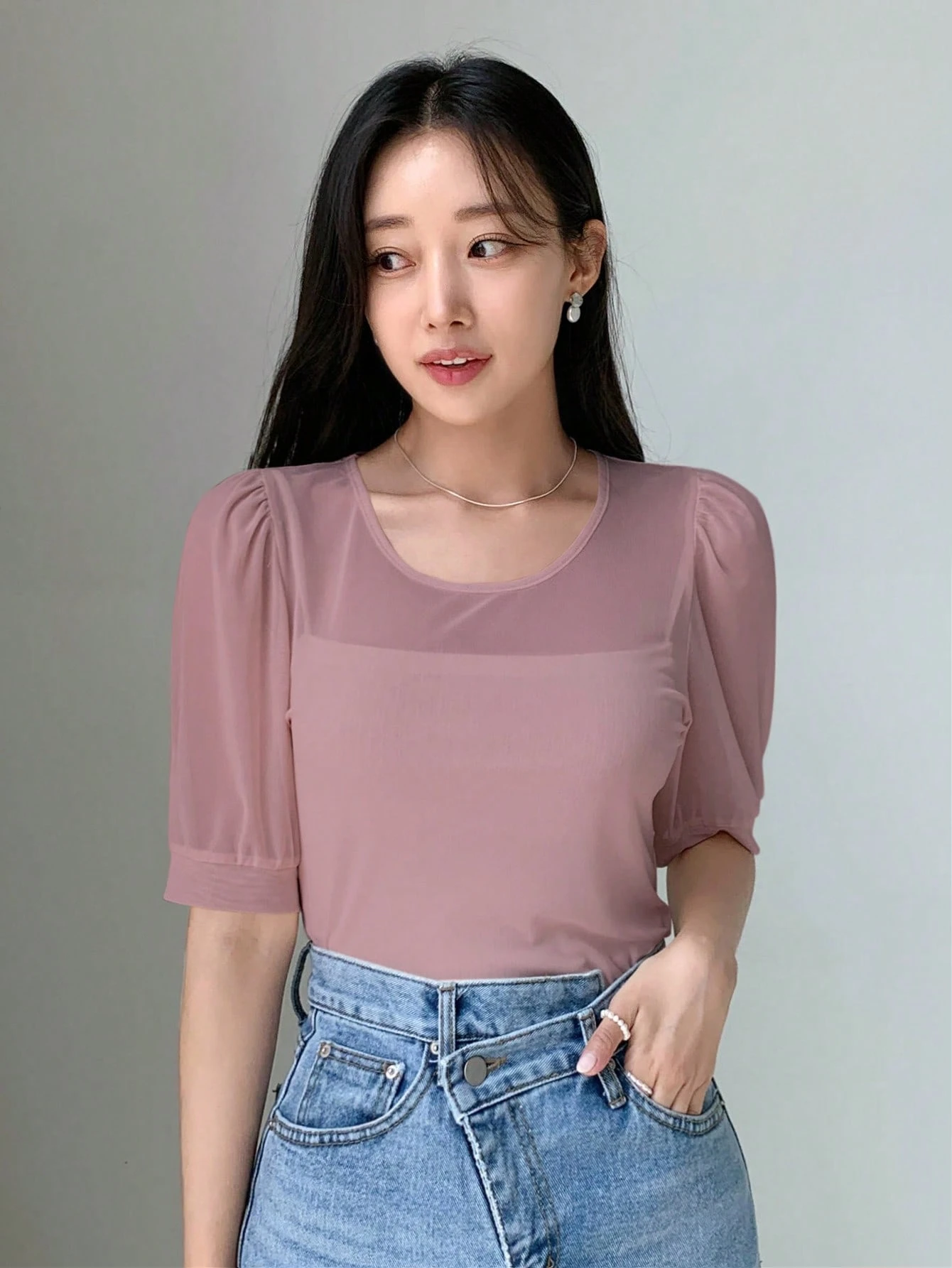 Layer it with your favorite cardigan for cooler evenings or wear it alone for a chic, airy feel. The Sheer Puff Sleeve Blouse by DAZY can be paired with jeans for a casual outing or a skirt for a more polished appearance. This versatile piece is designed for the modern woman who appreciates both comfort and style in her wardrobe. Experience the charm and versatility this blouse offers—add it to your collection today for countless stylish combinations.
