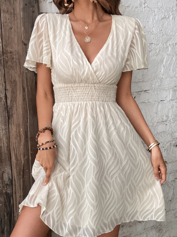 Perfectly charming and feminine, this cream/off-white mini dress blends style with comfort effortlessly. Its flattering V-neck wrap bodice shapes your silhouette elegantly, while the shirred (smocked) elastic waist provides both definition and all-day comfort. This combination ensures a tailored yet easy fit, allowing you to look your best while feeling as great as you look.