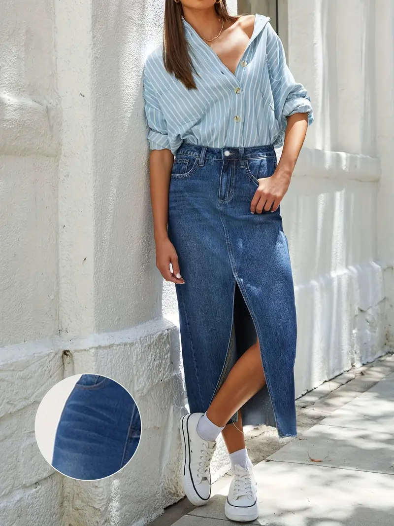 From casual outings to smart-casual gatherings, this denim maxi skirt transitions seamlessly between settings. Pair it with a tucked-in tee and sneakers for a laid-back, relaxed look, or style it with a fitted blazer and heels to achieve an effortless chic ensemble that turns heads wherever you go.