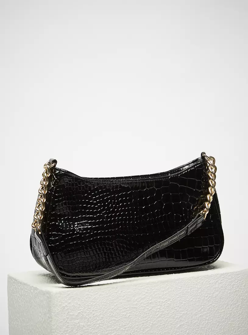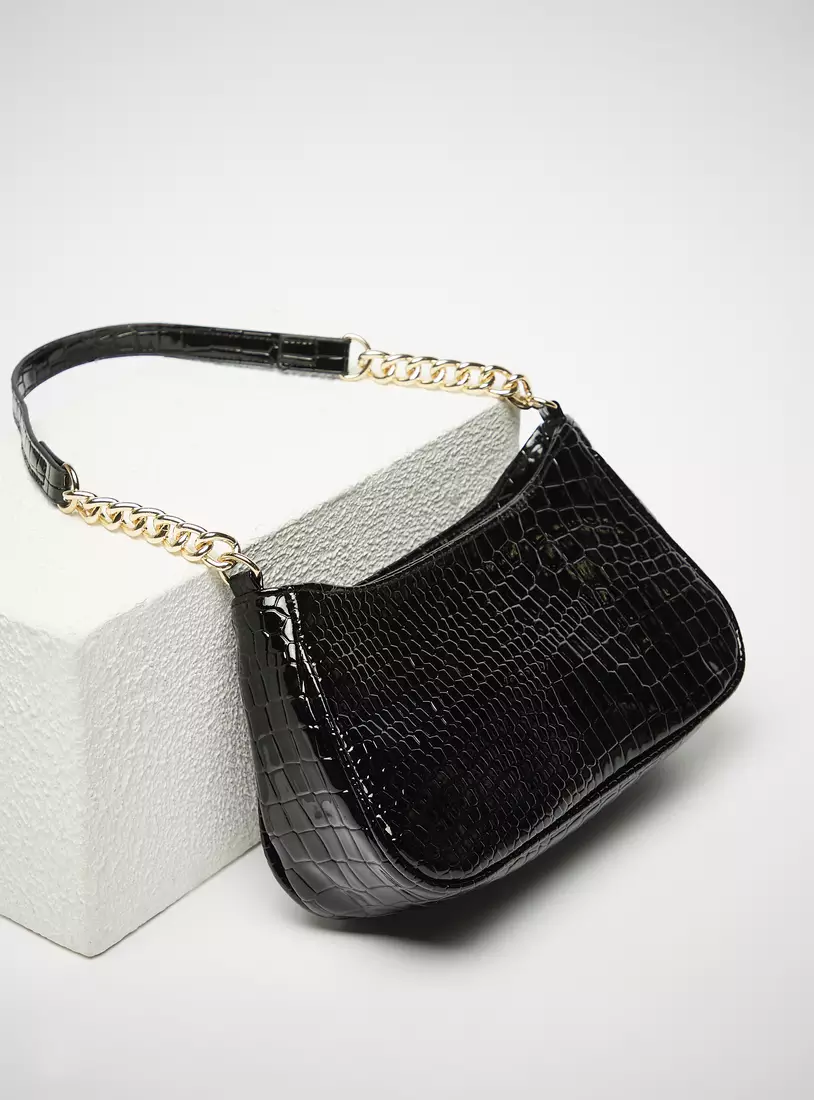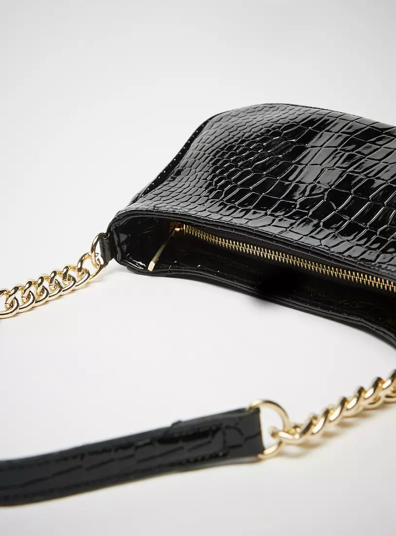 MAX Black Croc-Effect Baguette Bag with Gold Chain Strap