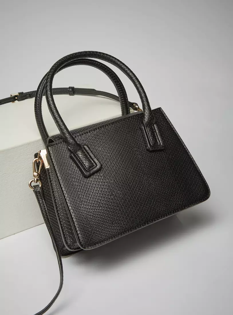 Elevate your style to new heights with the MAX mini-bag, a perfect blend of sophistication and practicality. Crafted with care, this mini-bag showcases a luxurious black faux-leather material, adorned with a stylish croc/snake-skin texture that exudes modern elegance. Its structured top-handle design provides a refined, polished look suitable for any occasion, from corporate events to casual outings.