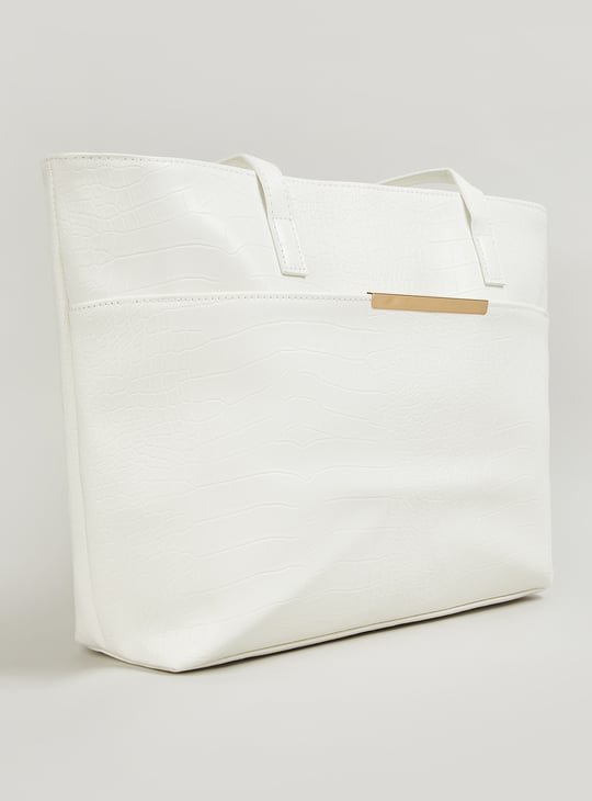 Elevate your daily ensemble with the Max Fashion white tote bag, a timeless accessory designed for those who appreciate style and practicality. This chic tote boasts a luxurious faux croc-embossed texture, perfectly complemented by a polished gold-tone bar accent. Whether you’re heading to the office, running errands, or catching up with friends, this bag effortlessly enhances your outfit, exuding sophistication and charisma.