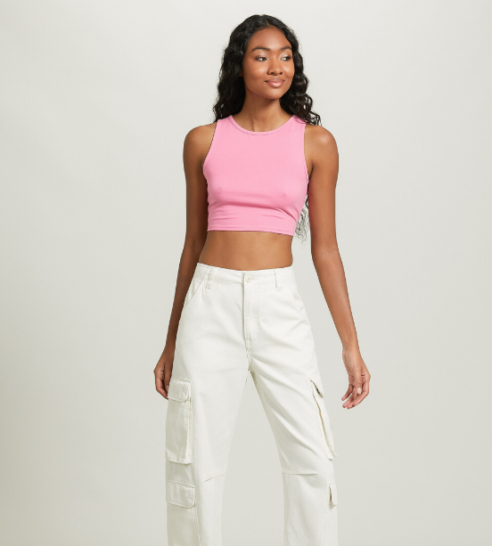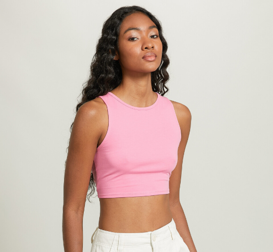 The bold candy pink hue delivers a pop of color that enlivens any outfit. The cropped hemline is thoughtfully designed to pair seamlessly with high-waisted denim, edgy cargo pants, or sporty joggers. This top stands out as a key foundation piece for mixing and matching, making it an indispensable addition to your closet.