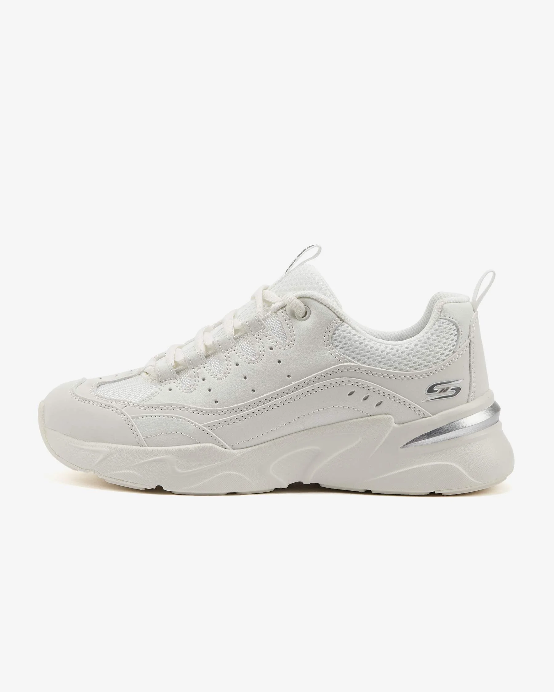 Revamp your wardrobe with the iconic Skechers D’Lites – Fresh Start sneakers. Renowned for their retro, chunky design, these shoes seamlessly blend style, comfort, and functionality. Crafted with a high-quality smooth leather and synthetic upper, the clean white colorway exudes a versatile appeal, while metallic silver trim adds a refreshing touch of shimmer. Whether you’re dressing up or dressing down, these sneakers are the perfect way to inject a sporty-chic vibe into any outfit.