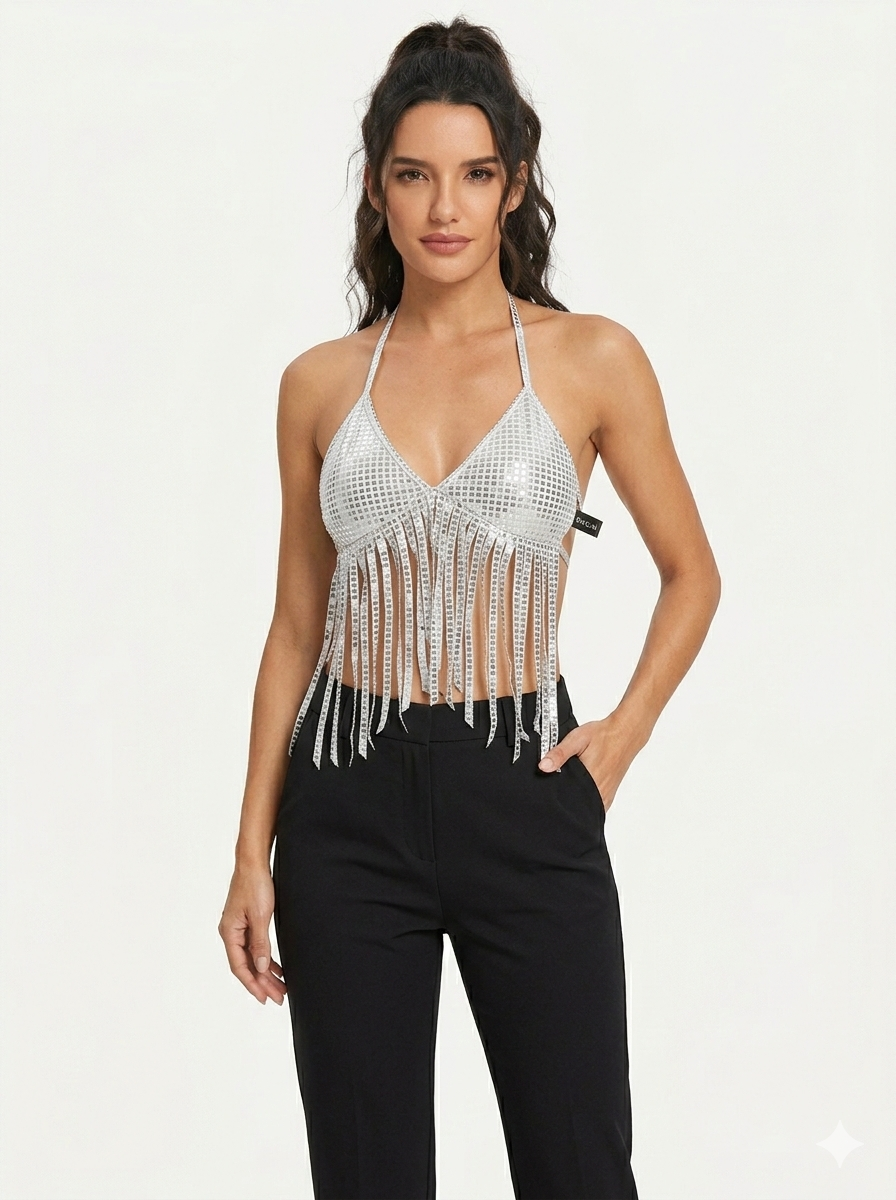 The Silver Sequin Fringe Halter Top is more than just a fashion item — it’s a statement piece! Pair it with high-waisted shorts for a trendy festival look or style it with a sleek skirt for a night of celebration. No matter the occasion, this bralette transforms your outfit with its undeniable sparkle.