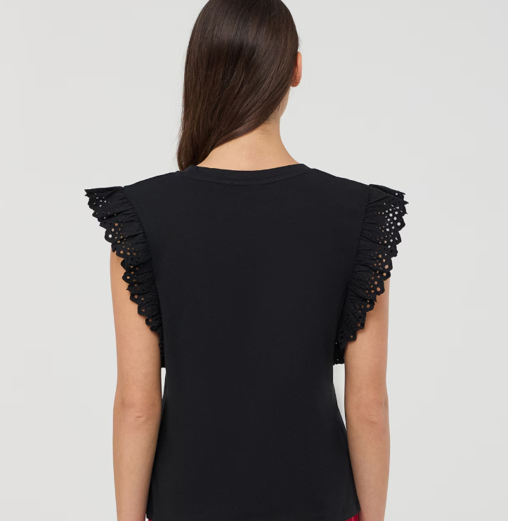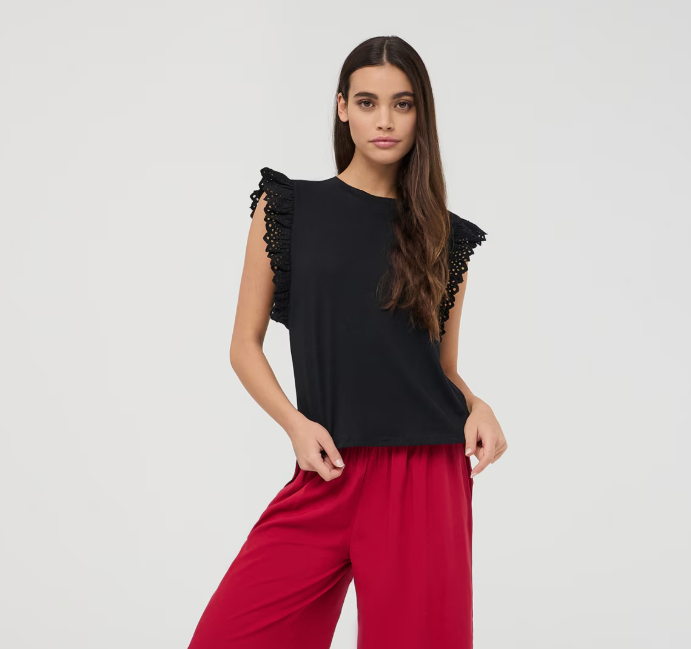 The Terranova black sleeveless top is the ultimate blend of effortless style and everyday comfort. Designed to make you feel confident and chic, this top features delicate broderie anglaise ruffle sleeves that lend a touch of elegance to any outfit. Whether you’re heading out for a casual brunch or a relaxed evening, this versatile piece adds a distinctive flair to your wardrobe.