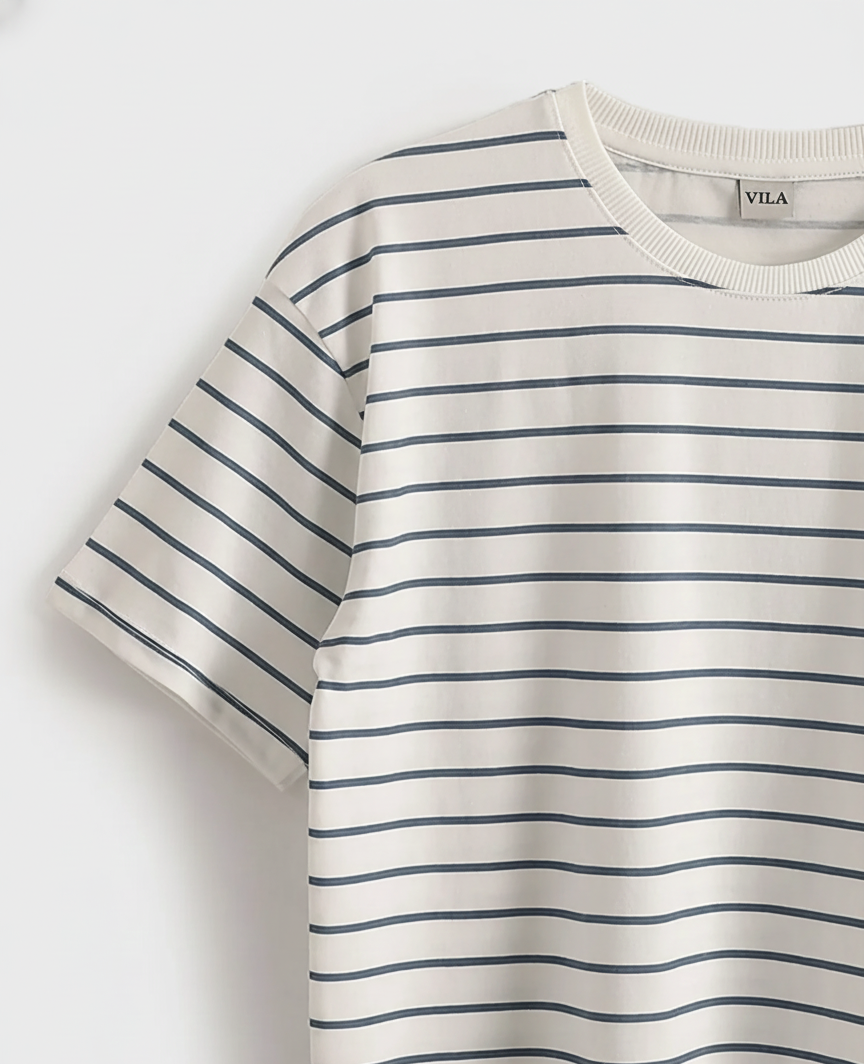 Achieve effortless French chic with the Vila Striped Relaxed Fit T-Shirt in off-white and navy. This thoughtfully designed piece combines classic stripes with modern relaxation, offering an unbeatable balance of timeless style and comfortable wear. It’s perfect for those who appreciate versatile and stylish everyday staples. With a relaxed fit, short sleeves, and a subtle crew neck adorned with fine ribbed detailing, this t-shirt embodies understated sophistication, making it an essential addition to your wardrobe.
