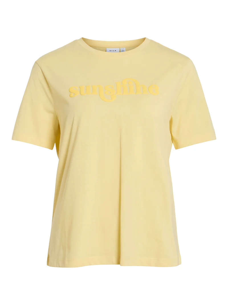 Brighten your wardrobe with the VILA ‘Sunshine’ T-Shirt, a true celebration of joy and vibrancy. Featuring a cheerful light yellow hue and a tasteful embossed or flocked ‘sunshine’ graphic across the chest, this tee is perfect for introducing a playful yet stylish touch to your casual wear. Designed for spring and summer days, it offers an effortless feel-good vibe that’s truly hard to resist.