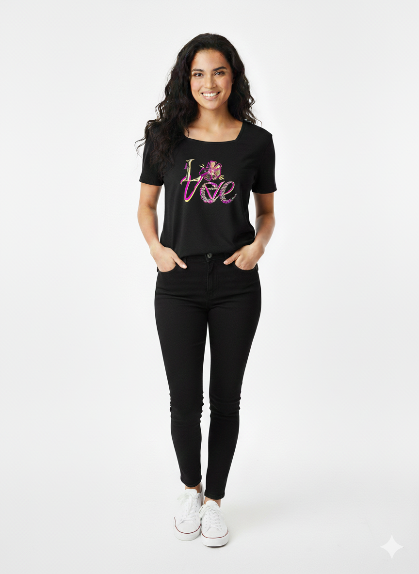 Make a statement with this chic, classic black t-shirt that combines timeless elegance with contemporary flair. The centerpiece of the design is a bold ‘Love’ graphic, crafted in cursive with magenta, pink, and purple tones. To add a touch of creativity, the ‘O’ features a subtle yet gorgeous floral motif, making this tee perfect for those who appreciate the finer details in their fashion choices.