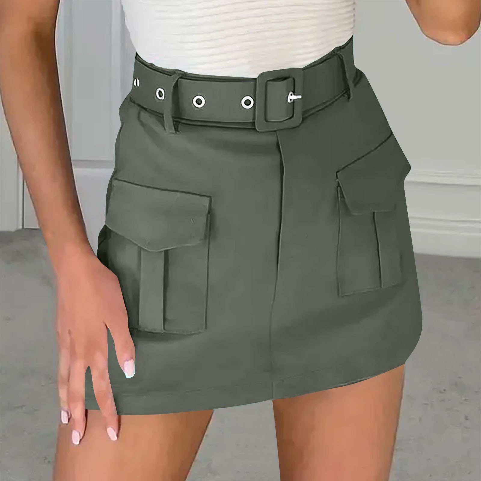 Women’s Cargo Mini Skirt with Matching Belt – Khaki Green High-Waisted Utility Skirt