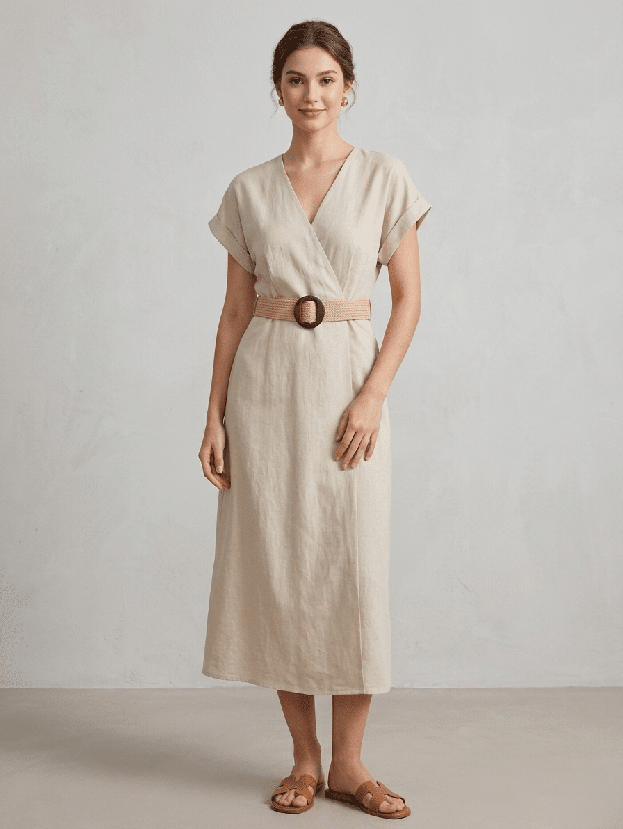Embrace effortless sophistication with this linen-blend midi dress, crafted to combine style and comfort seamlessly. The flattering V-neckline adds a timeless touch, while the cuffed short sleeves and tailored faux-wrap silhouette ensure a polished look for any occasion.