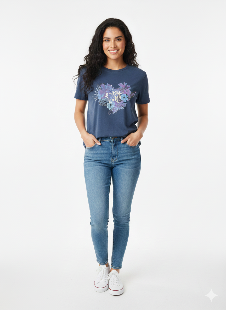 What sets this t-shirt apart is its thoughtfully designed graphic that captures the essence of joy and positivity. The heart-shaped print features muted purple and blue florals adorned with the inspiring message, “Enjoy Life.” Subtly incorporated into the design, this uplifting touch reminds you of the beauty in everyday moments. It’ll not only leave you feeling inspired but will also add an artsy and expressive vibe to your outfit.