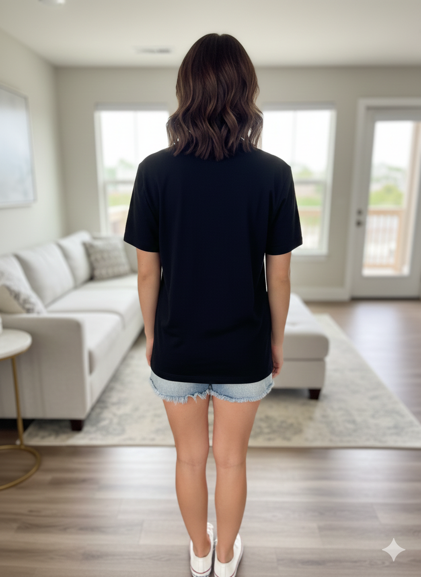 This black graphic tee is more than just a fashion statement—it’s an easy-to-style wardrobe essential. Its neutral base color provides the perfect canvas for accessorizing, while the bold graphic design serves as the centerpiece of your outfit. Pair it with casual sneakers during the day or elevate your look with ankle boots for a nighttime vibe. No matter how you style it, this tee is the go-to choice for blending personality with comfort.