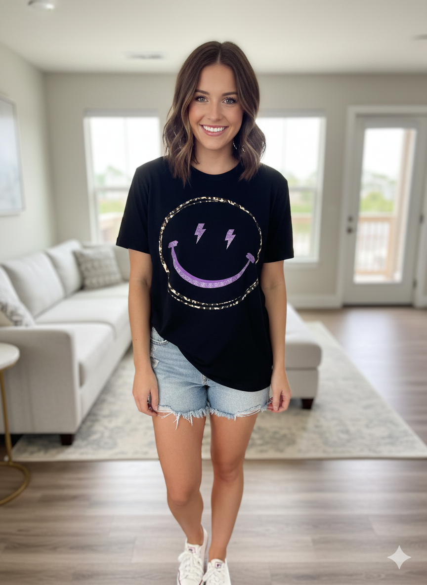 Make a bold statement while keeping it casual with this black graphic tee. Designed to highlight your playful personality, this t-shirt features a distressed-style smiley face graphic adorned with a striking purple lightning bolt. The eye-catching leopard print border adds just the right touch of contrast, making this piece stand out from your everyday wardrobe.