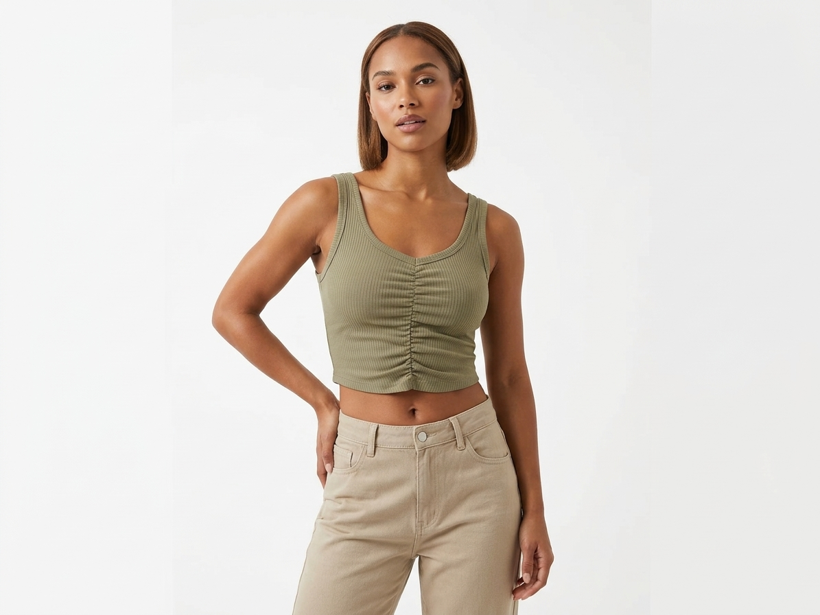 Add a trendy touch to your wardrobe with this olive green crop tank top. Designed with a contemporary scoop neckline and ruched drawstring detail at the center chest, this top promises effortless style and modern flair.