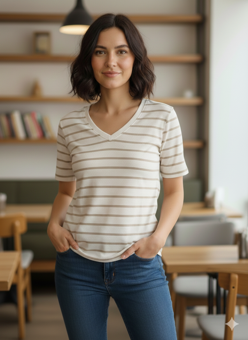 The semi-fitted silhouette and V-neckline make this top both timeless and contemporary. The streamlined fit enhances your natural shape without feeling restrictive, offering a clean yet effortless appearance. Its neutral stripe pattern is designed to complement a variety of outfits, so matching it with jeans, tailored trousers, or skirts is endlessly simple. Perfect for grocery runs or brunch meet-ups, this short-sleeve top quickly upgrades your casual look with understated elegance.