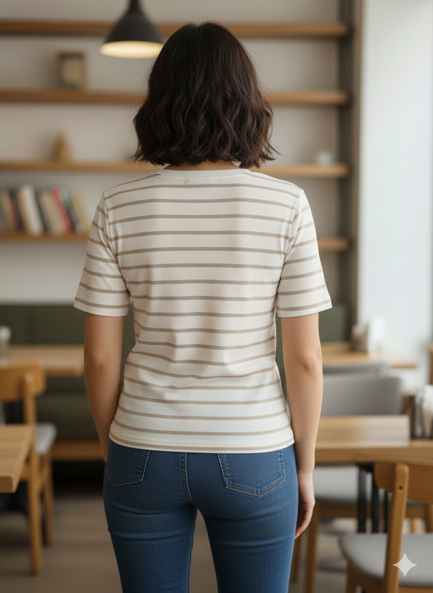 Looking for a versatile wardrobe essential that strikes the perfect balance between style and comfort? This elevated basic short-sleeve top is just what you need. Crafted with a soft, ribbed texture and featuring modern white and taupe neutral stripes, it’s designed to seamlessly fit into your casual wear collection while adding a polished edge to your outfits. Whether layered or worn solo, this piece is an easy standout addition to your wardrobe.