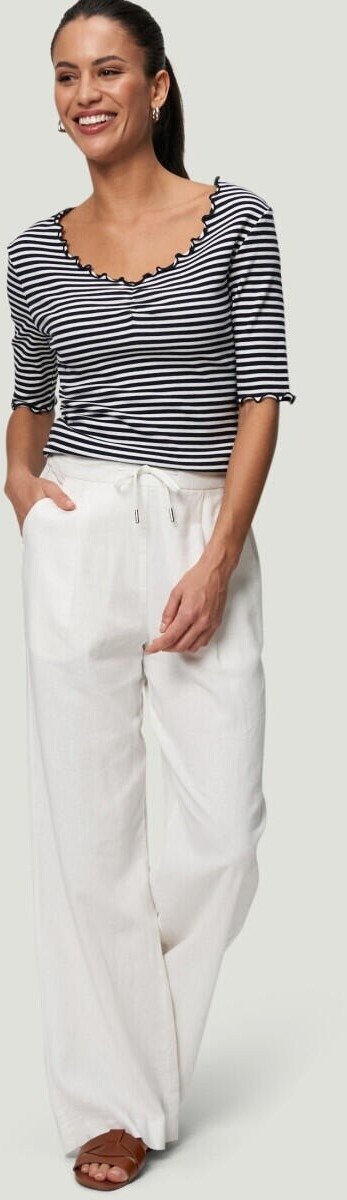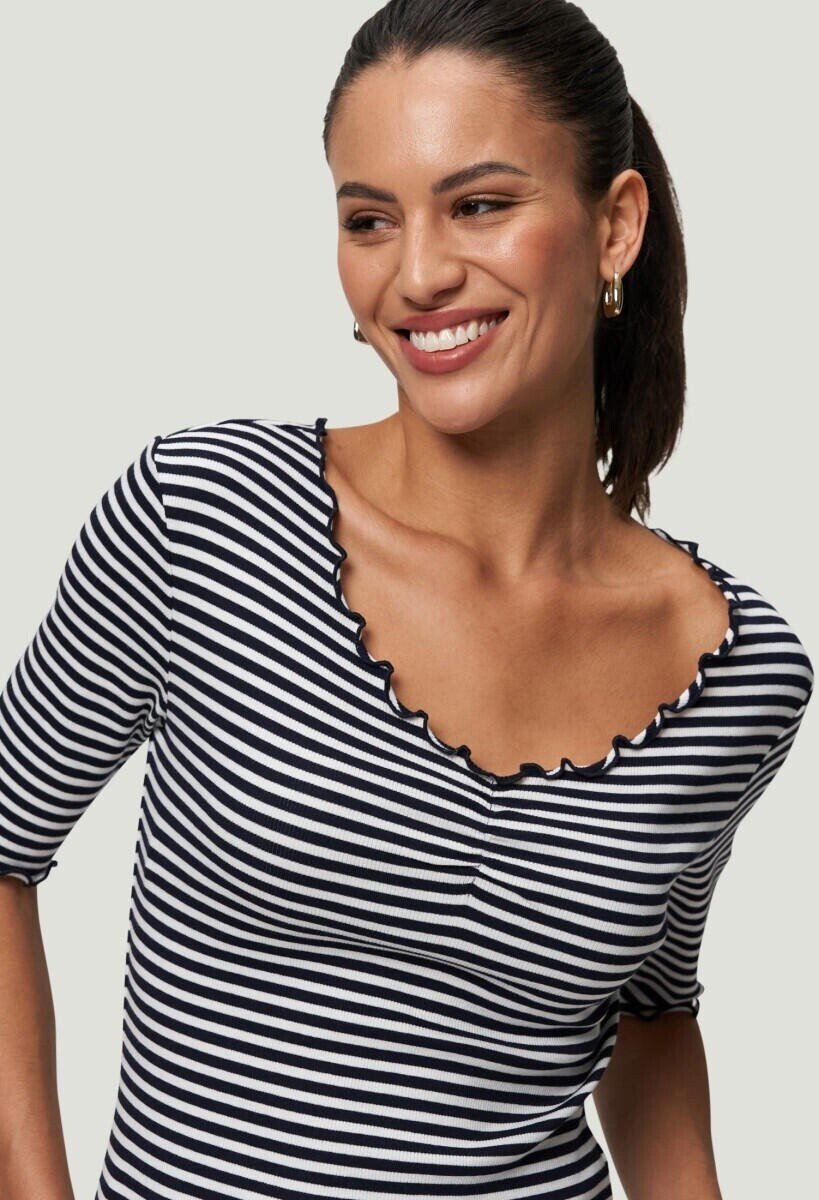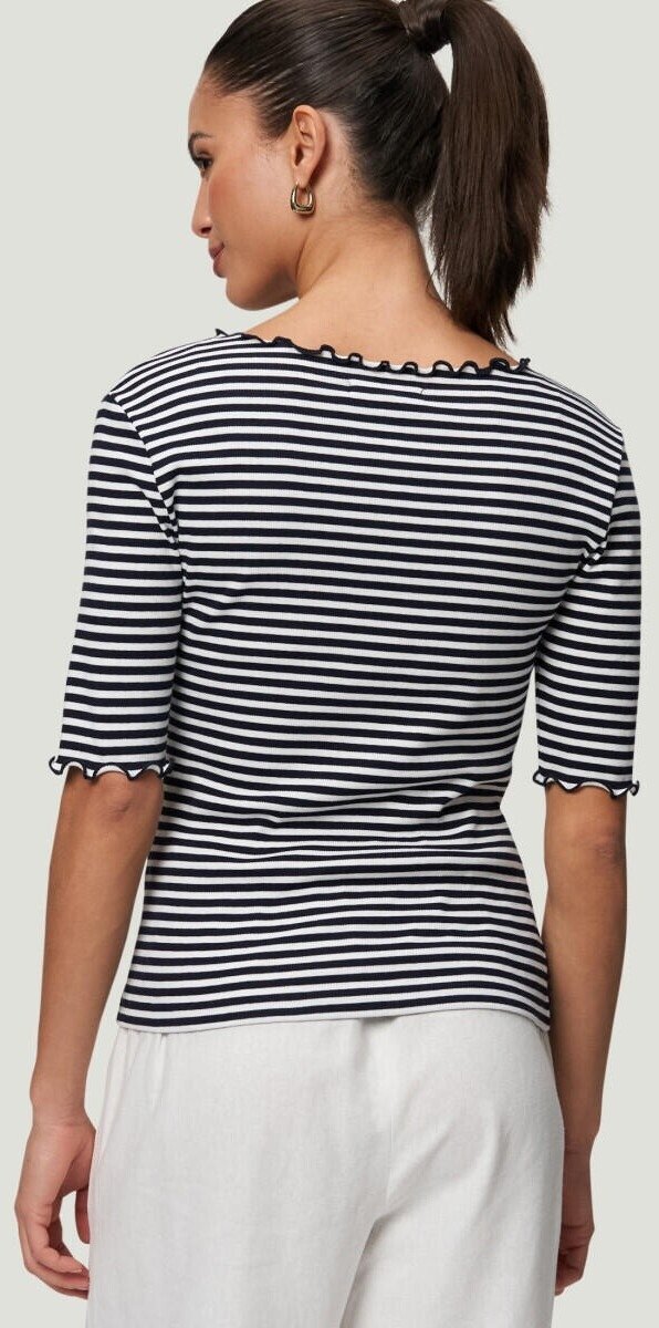 Designed with attention to detail, the 3/4 length sleeves offer practicality and elegance, making this shirt ideal for year-round wear. The charming frill or lettuce edge trim at the V-neckline and cuffs gives it a feminine touch, setting it apart from ordinary stripes. The structured yet flexible fit ensures that it flatters your silhouette without compromising on comfort, making it a delightful addition to any outfit.