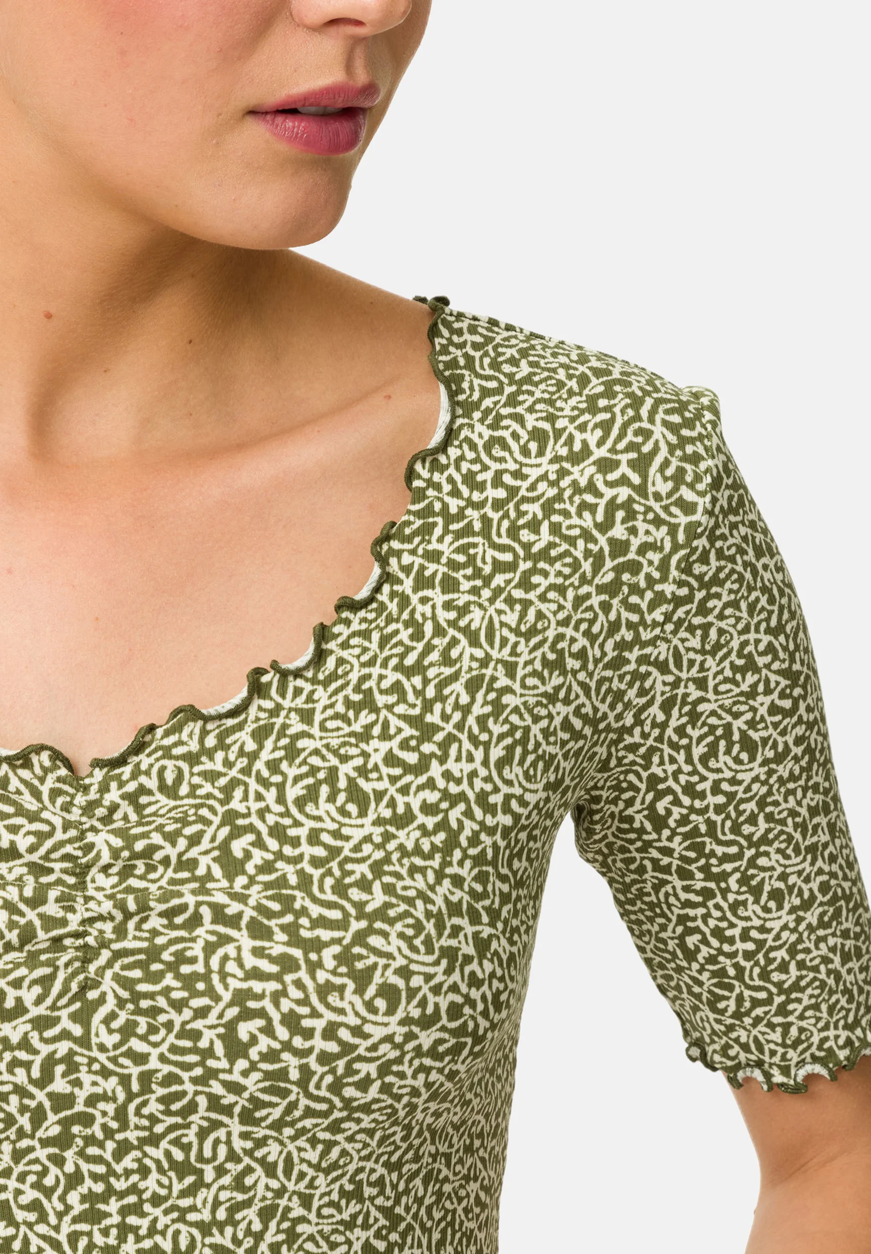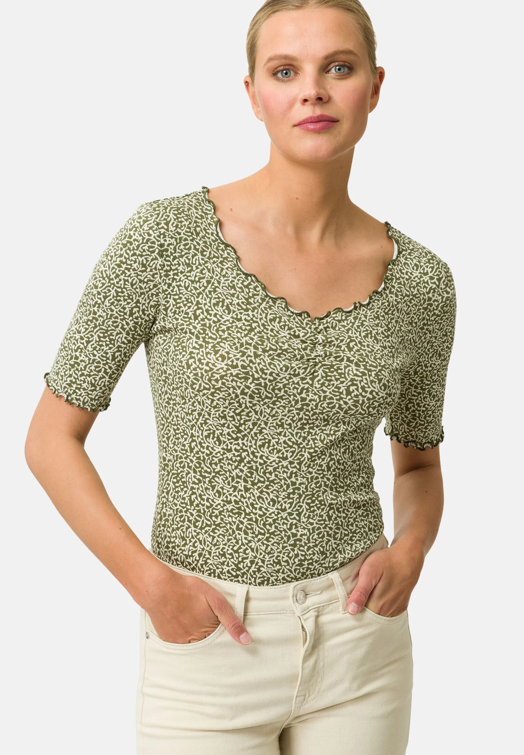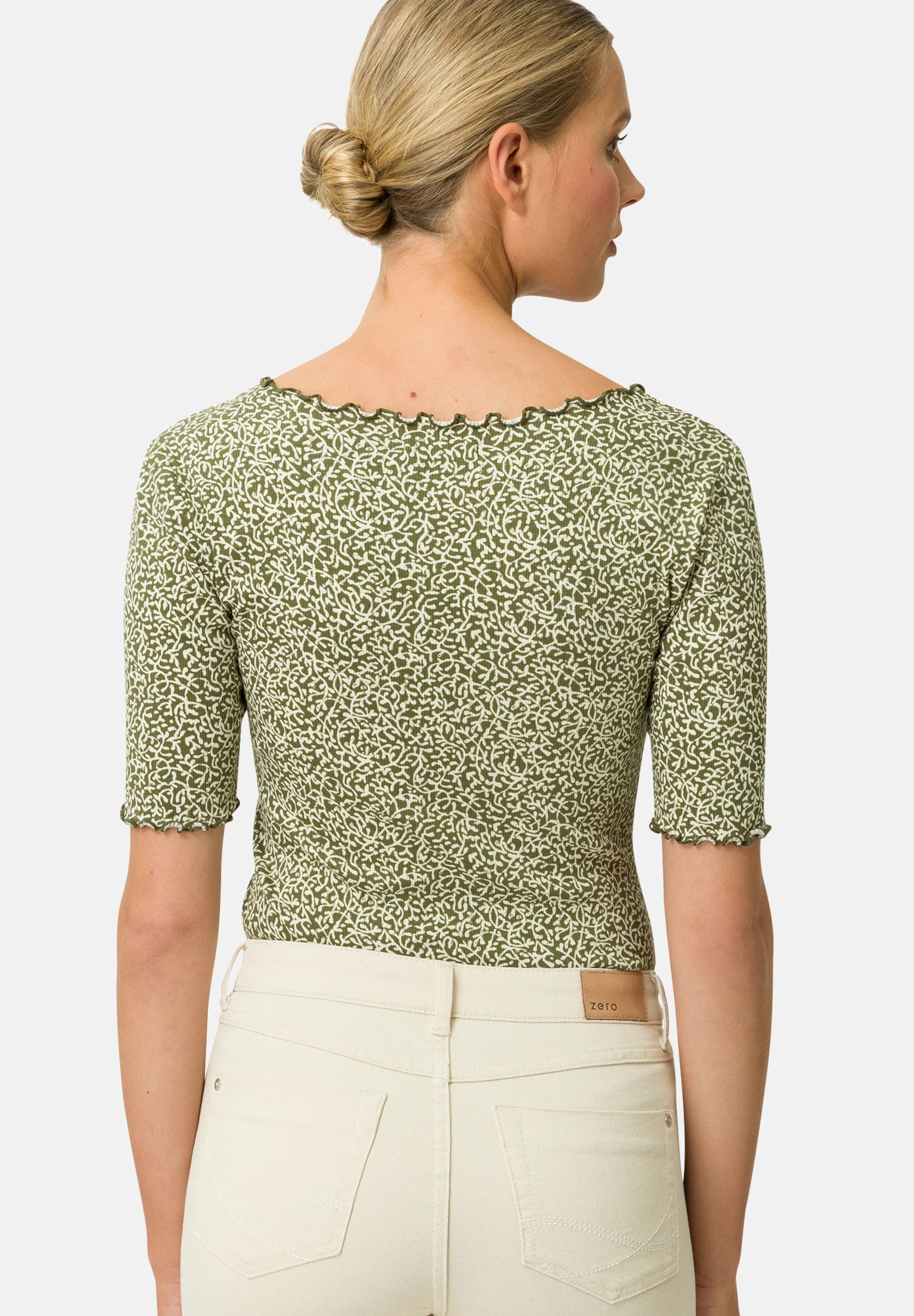 This top offers more than just style—it embodies versatility, comfort, and quality. The vibrant green and white organic print lends a fresh, contemporary feel, while the trendy scalloped-edge detailing ensures it stands out from the crowd. Whether you’re curating a capsule wardrobe or simply looking for a standout piece, this ZERO top is an excellent choice that you’ll cherish for seasons to come.